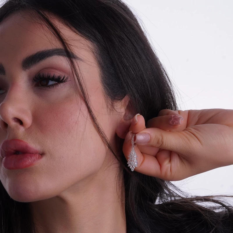 این گوشواره ظریف و درخشان با طراحی آبشاری و برگمانند، یکی از مدلهای چشمنواز شمیم سیلور است که برای استایلهای شیک و زنانه طراحی شده.ترکیب نگینهای مارکیز، باگت و تراشهای ریز گرد در کنار هم، جلوهای سهبعدی و پرنور ایجاد کرده که در حرکت سر، انعکاس نوری خیرهکننده و بسیار ظریف دارد.