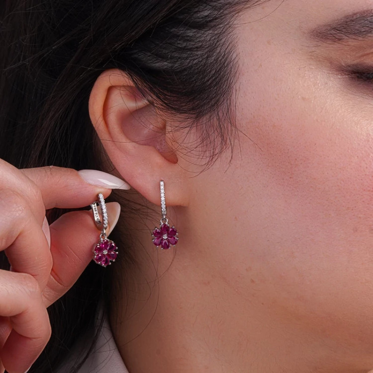 این گوشواره زیبا با طراحی گل صورتی، تجسمی از لطافت زنانه و درخشش دلنشین است. شش نگین زیرکونیای صورتی با تراش اشکی در کنار هم نشستهاند و شکوفهای ظریف و درخشنده را شکل دادهاند؛ گویی گل کوچکی با رنگی پرحرارت و زنده بر گوش شما شکفته است.