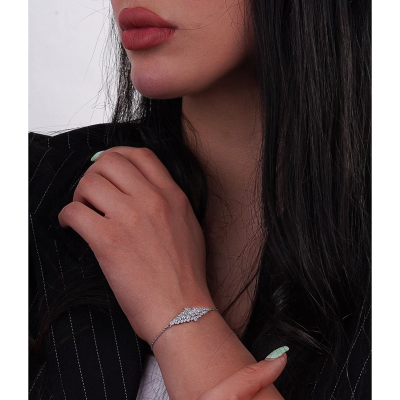 این دستبند ظریف نقره، با طراحی گلمانند و آرایشی از نگینهای مارکیز، باگت و ریز برلیانمانند زیرکونیا، جلوهای چشمگیر و درخشان دارد. قرارگیری سنگهای باگت در مرکز، جلوهای لوکس و مدرن ایجاد کرده و برگهای مارکیزتراش اطراف، آن را به طرحی کاملاً زنانه و لطیف تبدیل کرده است.بافت سبک، ظریف و بسیار درخشان این دستبند آن را مناسب استایلهای مجلسی، مهمانیهای رسمی و حتی هدیهای خاص و ماندگار کرده است.