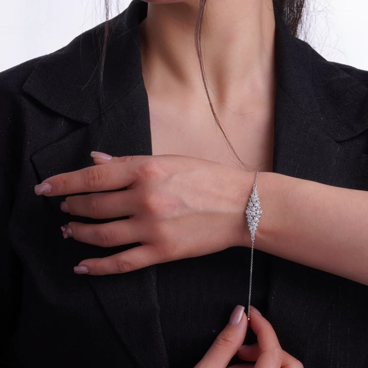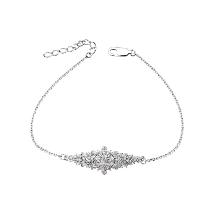 این دستبند ظریف نقره، با طراحی گلمانند و آرایشی از نگینهای مارکیز، باگت و ریز برلیانمانند زیرکونیا، جلوهای چشمگیر و درخشان دارد. قرارگیری سنگهای باگت در مرکز، جلوهای لوکس و مدرن ایجاد کرده و برگهای مارکیزتراش اطراف، آن را به طرحی کاملاً زنانه و لطیف تبدیل کرده است.بافت سبک، ظریف و بسیار درخشان این دستبند آن را مناسب استایلهای مجلسی، مهمانیهای رسمی و حتی هدیهای خاص و ماندگار کرده است.