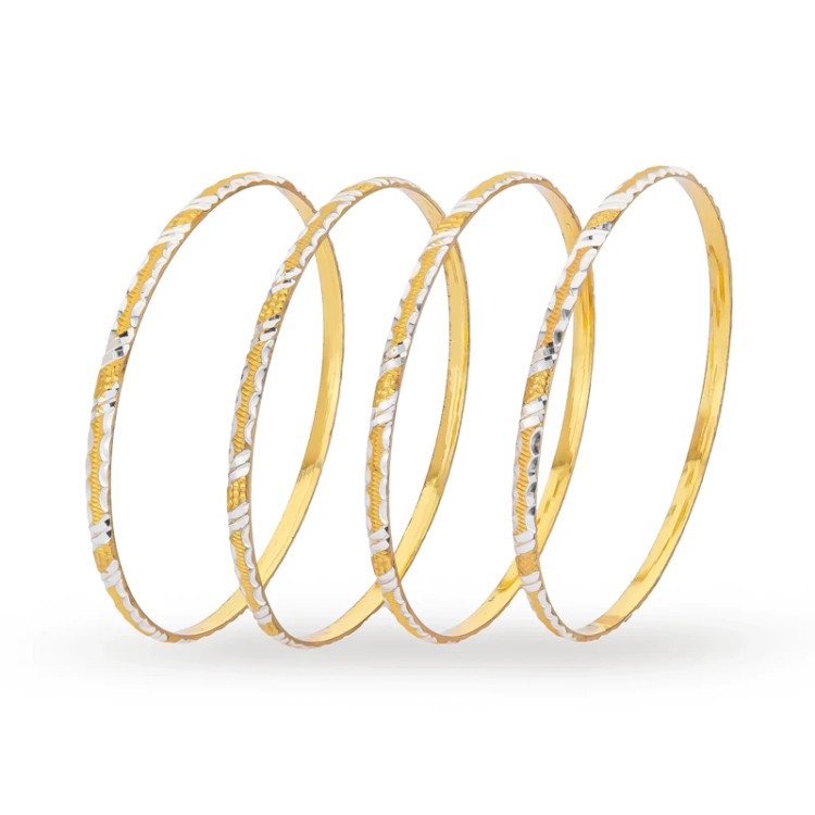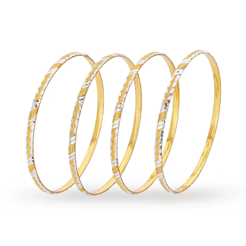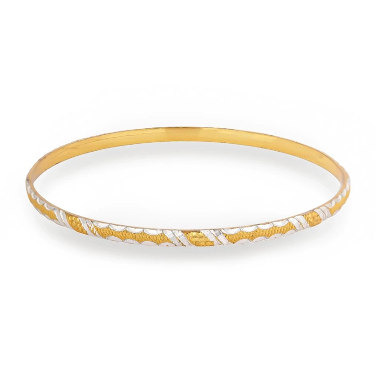 ترکیب این خطوط موجدار با بافتهای ریز و تراشخورده باعث شده سطح النگو در برخورد با نور، درخششی زنده و متفاوت داشته باشد. این نوع طراحی، بدون استفاده از نگین، تنها با هنر تراش روی فلز، جلوهای لوکس و ظریف ایجاد کرده است.