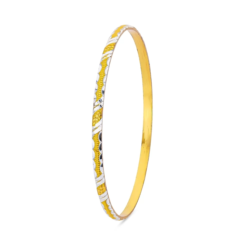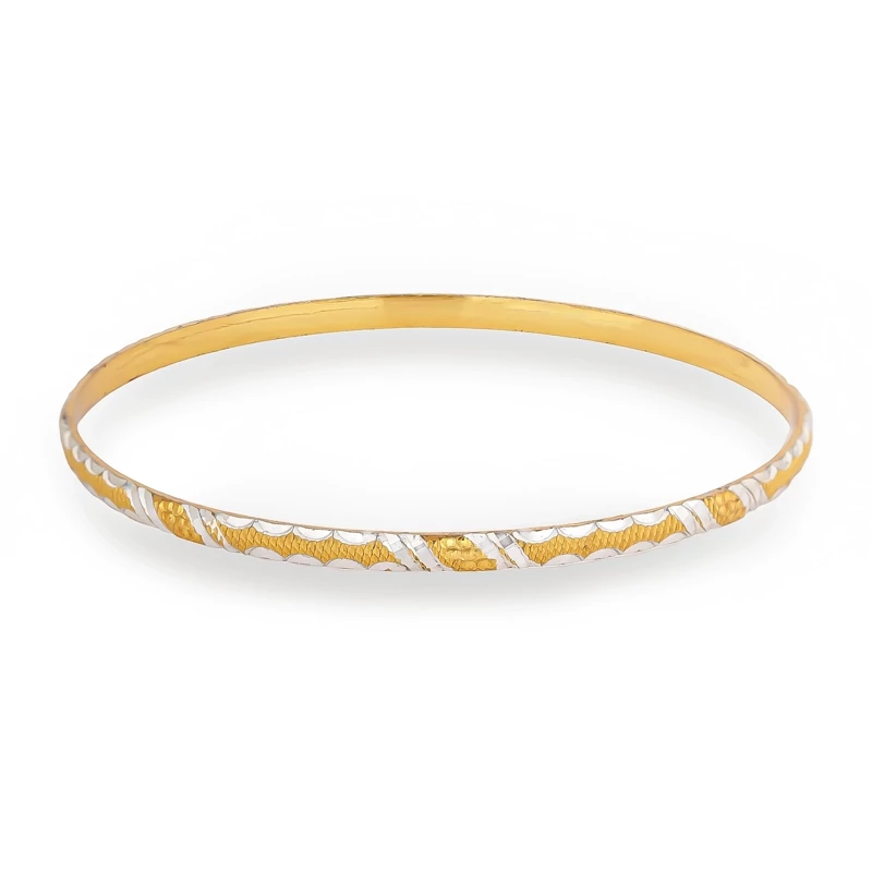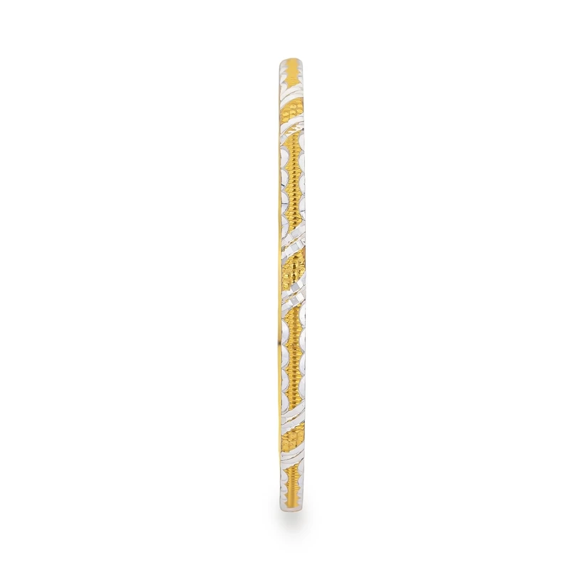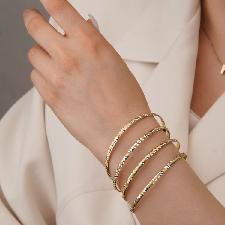 استفاده از آبکاری دو رنگ، با فضای داخلی طلایی و سطح بیرونی نقرهای همراه با جزئیات طلایی، تضادی دلنشین ایجاد کرده که زیبایی این مدل را دوچندان میکند. این ویژگی باعث میشود النگو بهراحتی با انواع زیورآلات دیگر هماهنگ شود.
