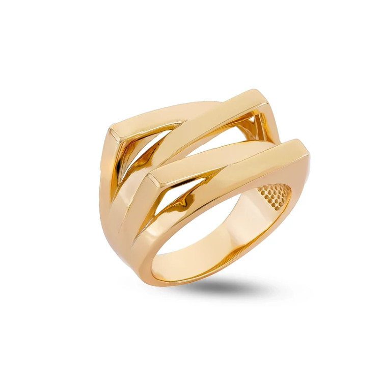 این انگشتر زنانه مدرن با طراحی خاص و چندلایه، از نقره عیار 925 ساخته شده و با آبکاری طلایی براق جلوهای لوکس و چشمگیر دارد. فرم حجمی و خطوط نرم و همپوشان در طراحی، حس قدرت، اعتمادبهنفس و استایل مدرن را بهخوبی منتقل میکند.