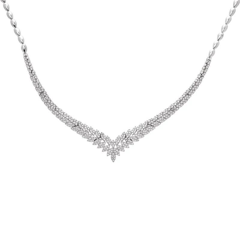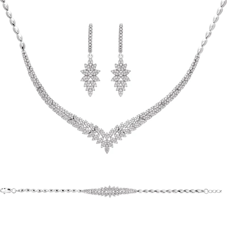 گردنی سرویس با طراحی V شکل، به زیبایی روی گردن مینشیند و جلوهای کشیده و شیک ایجاد میکند.گوشوارههای آویزدار با فرم چندلایه برگ، درخشش چشمگیری در نور ایجاد میکنند.دستبند سرویس نیز با طراحی هماهنگ، ست را کامل کرده و زیبایی آن را دوچندان میسازد.