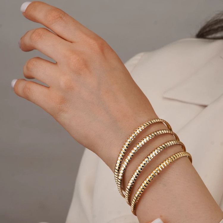 طراحی این النگو از نظم هندسی و خطوط موازی الهام گرفته است. این خطوط در کنار یکدیگر حس حرکت و ظرافت را القا میکنند و باعث میشوند النگو با وجود طراحی ساده، جلوهای مدرن و لوکس داشته باشد.