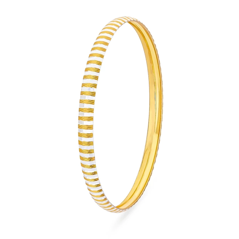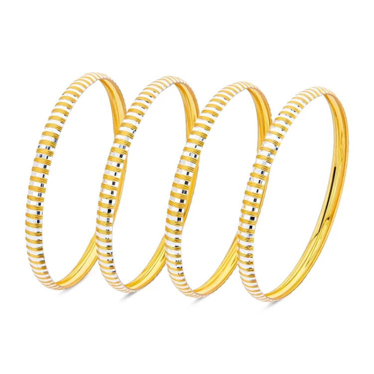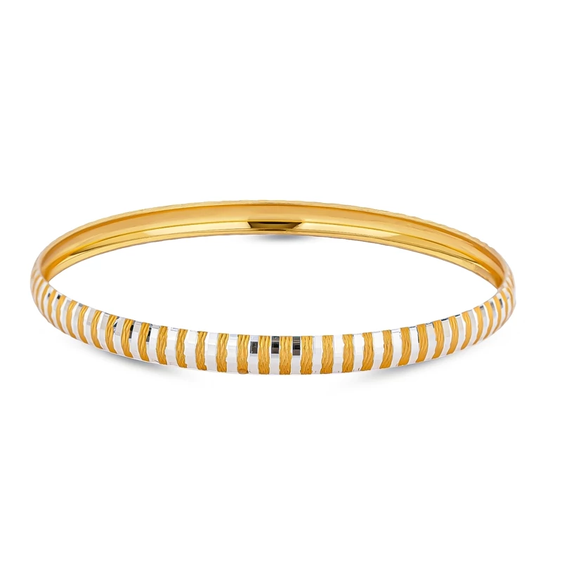 در این مدل از آبکاری دو رنگ استفاده شده است؛ بهطوریکه بخش داخلی النگو با رنگ طلایی درخشان و قسمت بیرونی با ترکیبی از رنگ نقرهای و خطوط طلایی تزئین شده است. این تضاد رنگی باعث میشود النگو جلوهای متفاوت و شیک داشته باشد و بهراحتی با سایر زیورآلات ست شود.