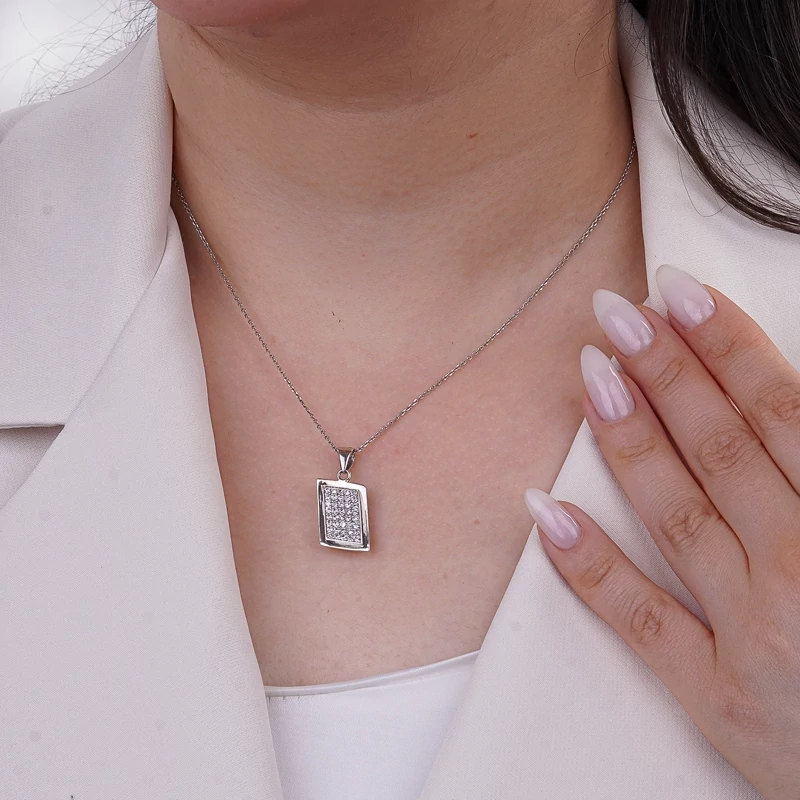 این پلاک نقره با طراحی هندسی مدرن و خطوط زاویهدار، جلوهای مینیمال و در عین حال درخشان را به نمایش میگذارد. فرم لوزیشکل پلاک، با قاب نقرهای صیقلی احاطه شده و سطح داخلی آن با نگینهای ریز زیرکونیای شفاف پوشانده شده است که نور را بهصورت یکنواخت و ظریف بازتاب میدهد.