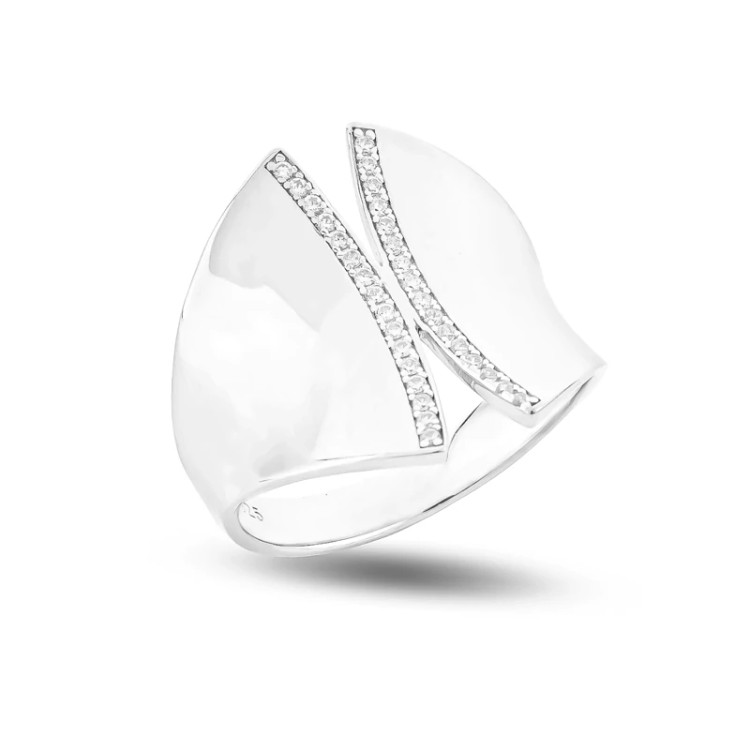 انگشتر نقره زنانه طرح «برش نقرهای» با فرم حجمی و خطوط شکسته، جلوهای جسورانه و معاصر روی دست ایجاد میکند. سطح پهن و صیقلی نقره در کنار دو ردیف نگین خطی، تضادی زیبا میان سادگی فلز و درخشش ظریف نگینها بهوجود آورده است.