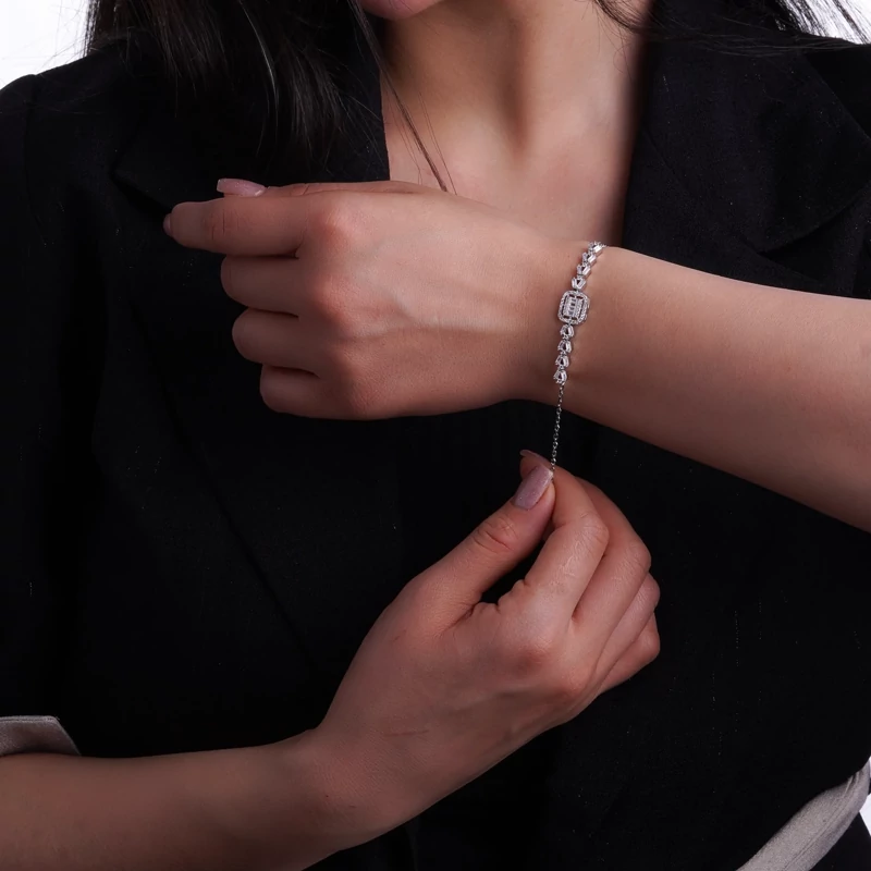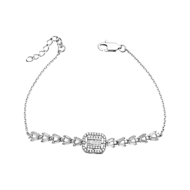 این دستبند ظریف و درخشان از مجموعه خاص شمیم سیلور، با طراحی مدرن و پرجلوه ساخته شده است. حضور سنگهای زیرکونیای بگت در مرکز و چیدمان هندسی منظم آن، جلوهای چشمگیر و متفاوت ایجاد کرده که یادآور زیورآلات فاخر اروپایی است.نگینهای میکروست اطراف، نور را بهزیبایی بازتاب میدهند و همراهی زنجیر ظریف نقره ۹۲۵، محصول را به یک اکسسوری شیک و ماندگار تبدیل کرده است.