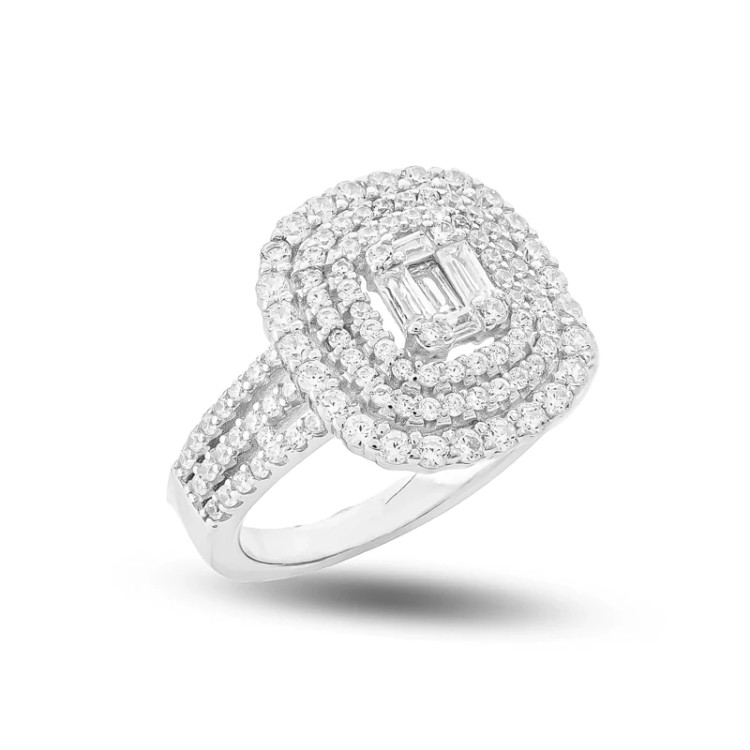 انگشتر نقره زنانه طرح «هاله امپریال» نمادی از شکوه کلاسیک در قالبی مدرن است. نگین مرکزی مربعی با برش باگت، در میان چندین ردیف نگینهای درخشان هالهای قرار گرفته و جلوهای منظم، فاخر و کاملاً جواهری ایجاد کرده است.