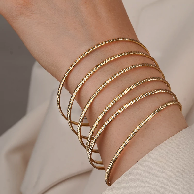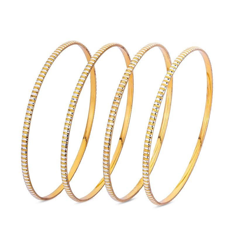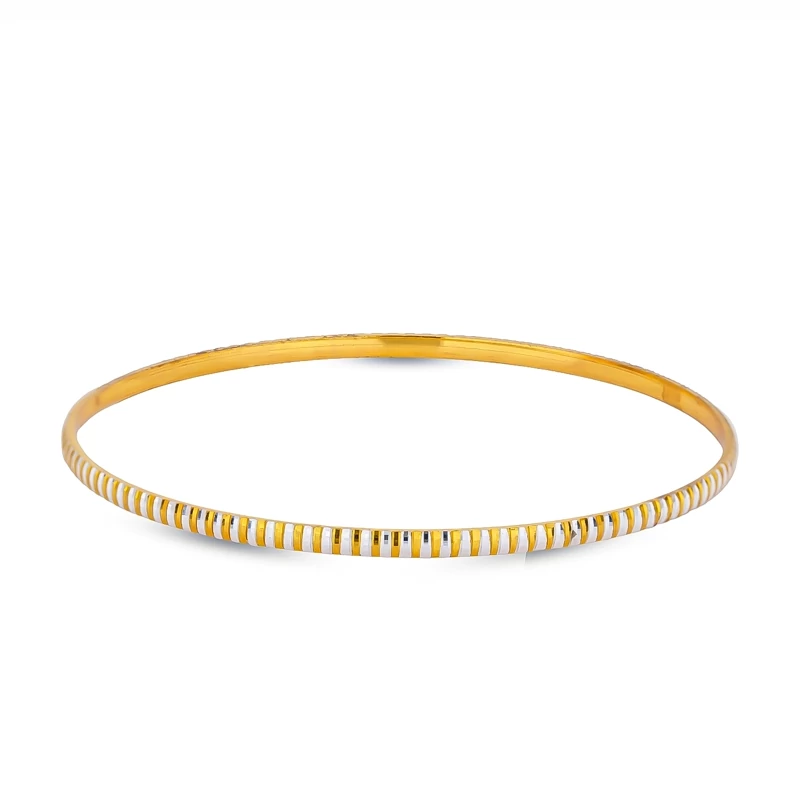 النگو نقره زنانه کد 20800000036 با طراحی باریک و خطوط منظم دو رنگ، جلوهای ظریف و مدرن روی دست ایجاد میکند. ترکیب طلایی و نقرهای در کنار شیارهای تراشخورده، باعث انعکاس نور و ایجاد درخششی ملایم و چشمنواز شده است.