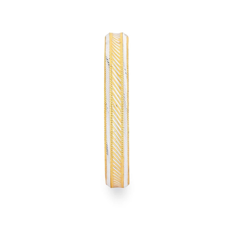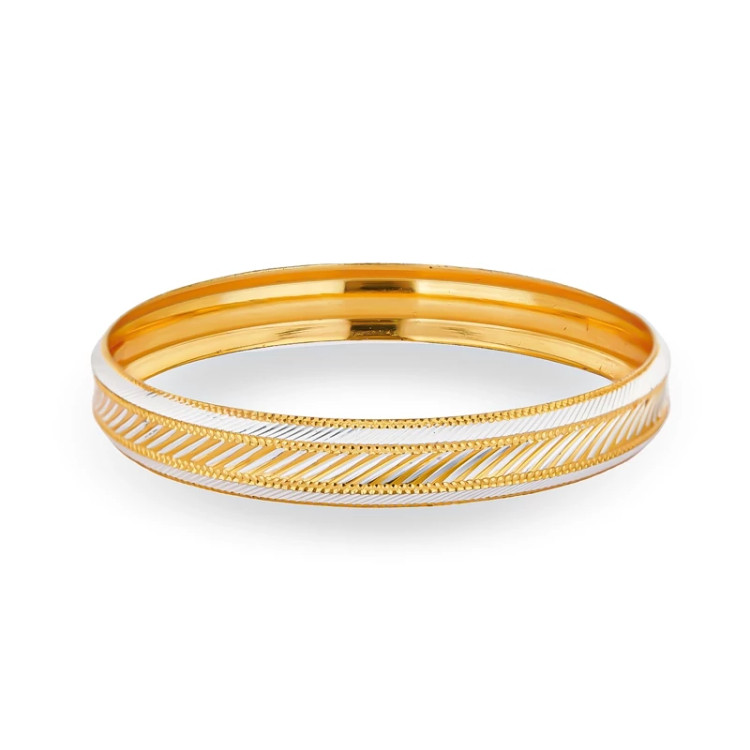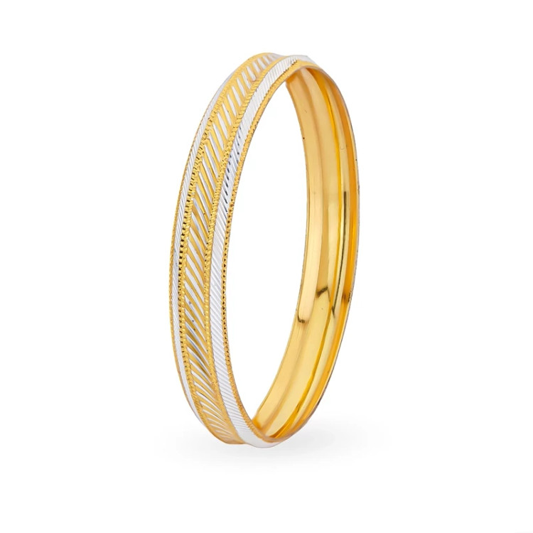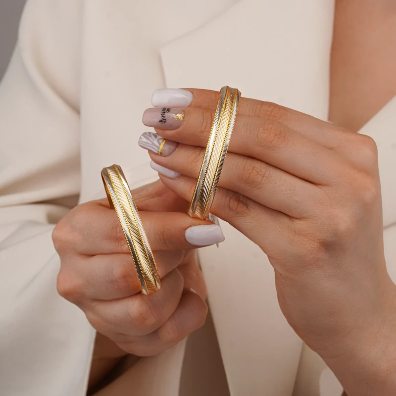 النگو نقره زنانه کد 20800000010 با طراحی دو رنگ و خطوط مورب منظم، جلوهای ظریف و در عین حال شیک روی دست ایجاد میکند. ترکیب زمینه طلایی براق در قسمت داخلی با خطوط نقرهای و حاشیههای بافتدار طلایی در بخش بیرونی، حس ظرافت و نظم هندسی را به زیبایی نمایش میدهد.