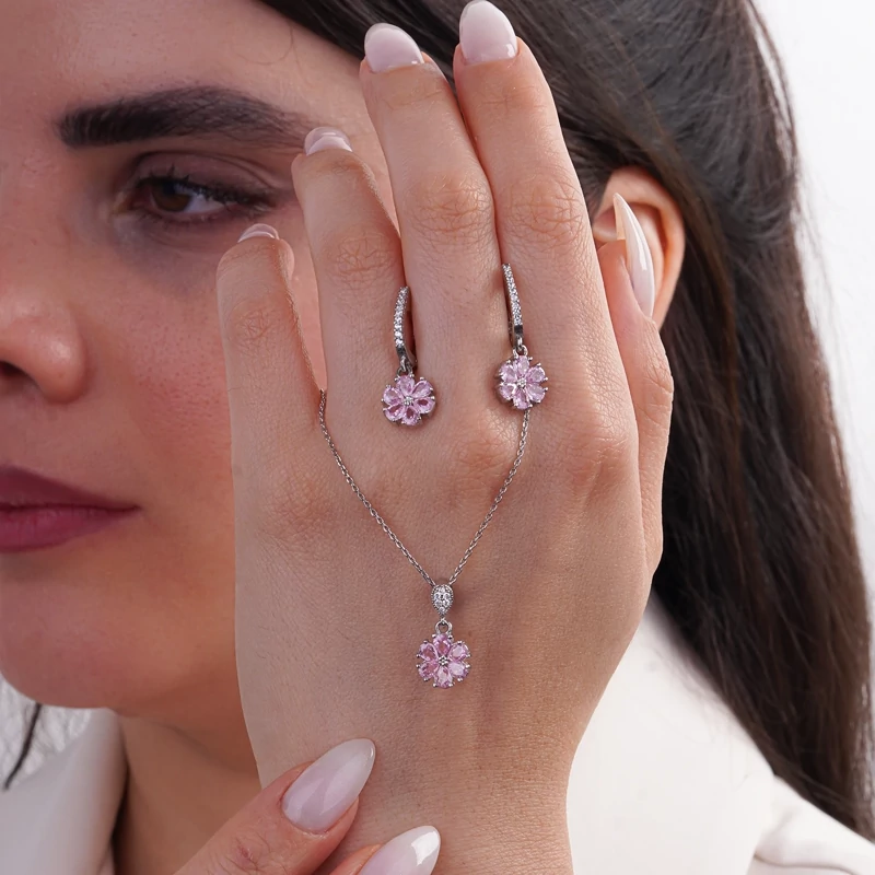 این نیمست ظریف و دلنشین با طراحی گل ششپر، از ترکیب نگینهای صورتی تراش اشکی و مرکزی سفید ساخته شده و جلوهای لطیف، زنانه و عاشقانه را خلق میکند.نگینهای صورتی با درخششی لطیف، روحی رمانتیک و بهاری به کار میبخشند و نگینهای سفید ریز، درخشش نقره را دوچندان میسازند.گوشوارهها با قفل لولادار راحت و ایمن طراحی شدهاند و پلاک نیز به سبب وزن سبک، انتخابی ایدهآل برای استفادهی روزانه یا مهمانی محسوب میشود.