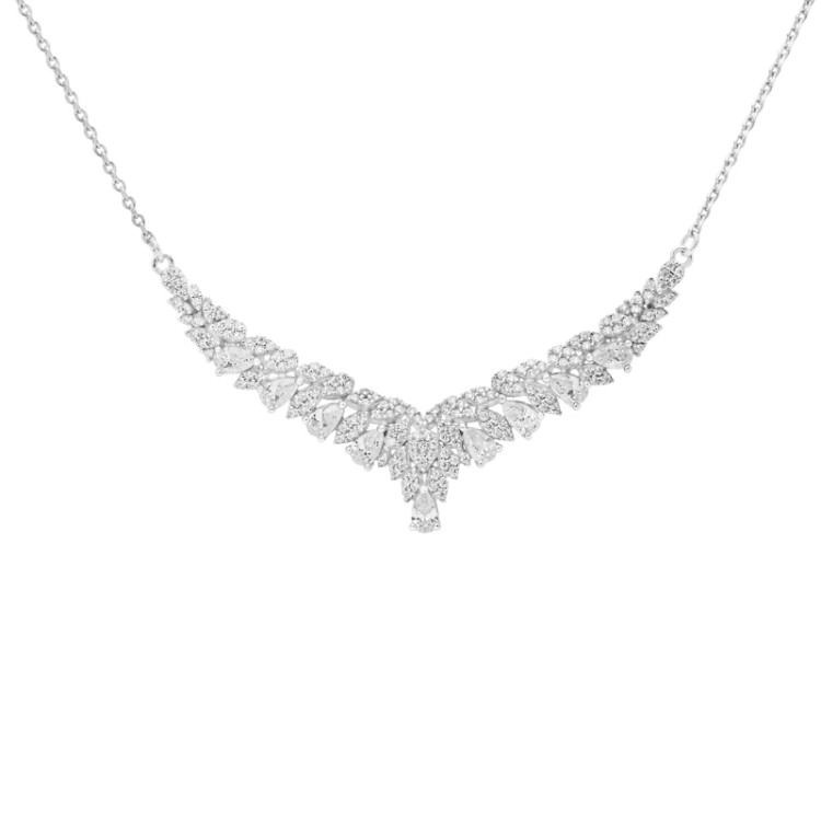 فرم V شکل گردنبند، روی خط گردن مینشیند و به دلیل طراحی پرجزئیات و خیرهکنندهاش، یک گزینه فوقالعاده برای بانوانی است که به استایل مجلسی با جزئیات ظریف و جلوهی الماسی علاقه دارند.